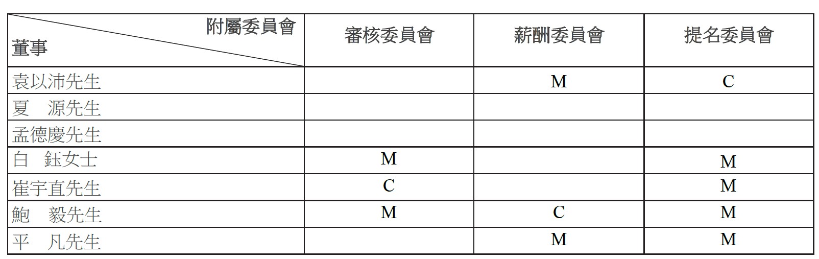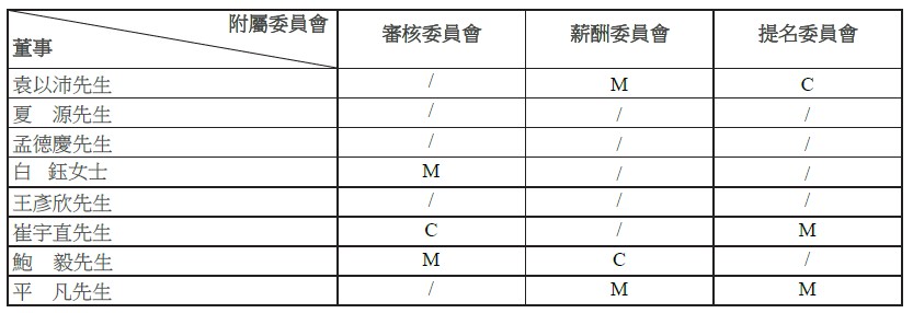 董事會下設三個常設附屬委員會。下表提供若干董事會成員在這些附屬委員會中所擔任的職位: